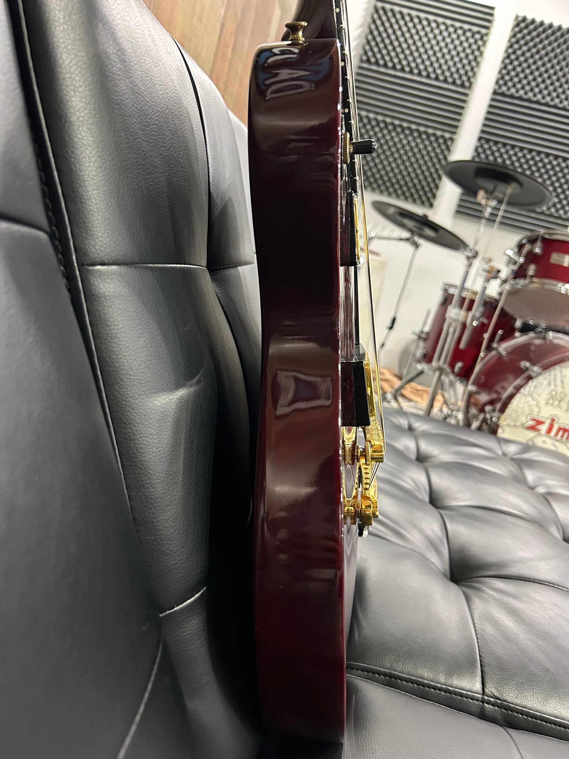 That deep wine-red finish and gold hardware make it look like it’s about to headline a stadium—or at least impress everyone at band practice. It’s heavy, punchy, and built for solos that say, “I didn’t come here to noodle—I came here to wail.”
