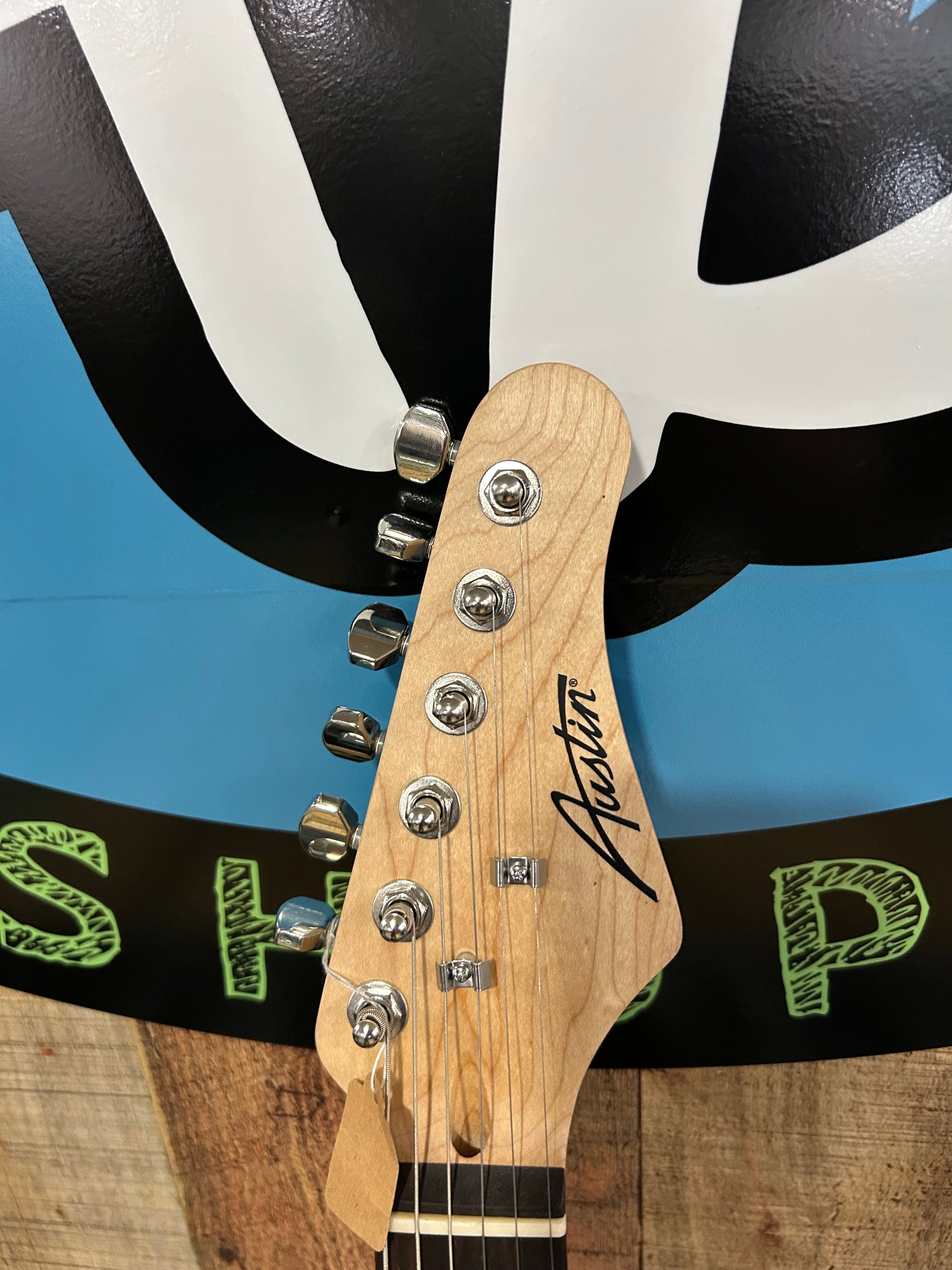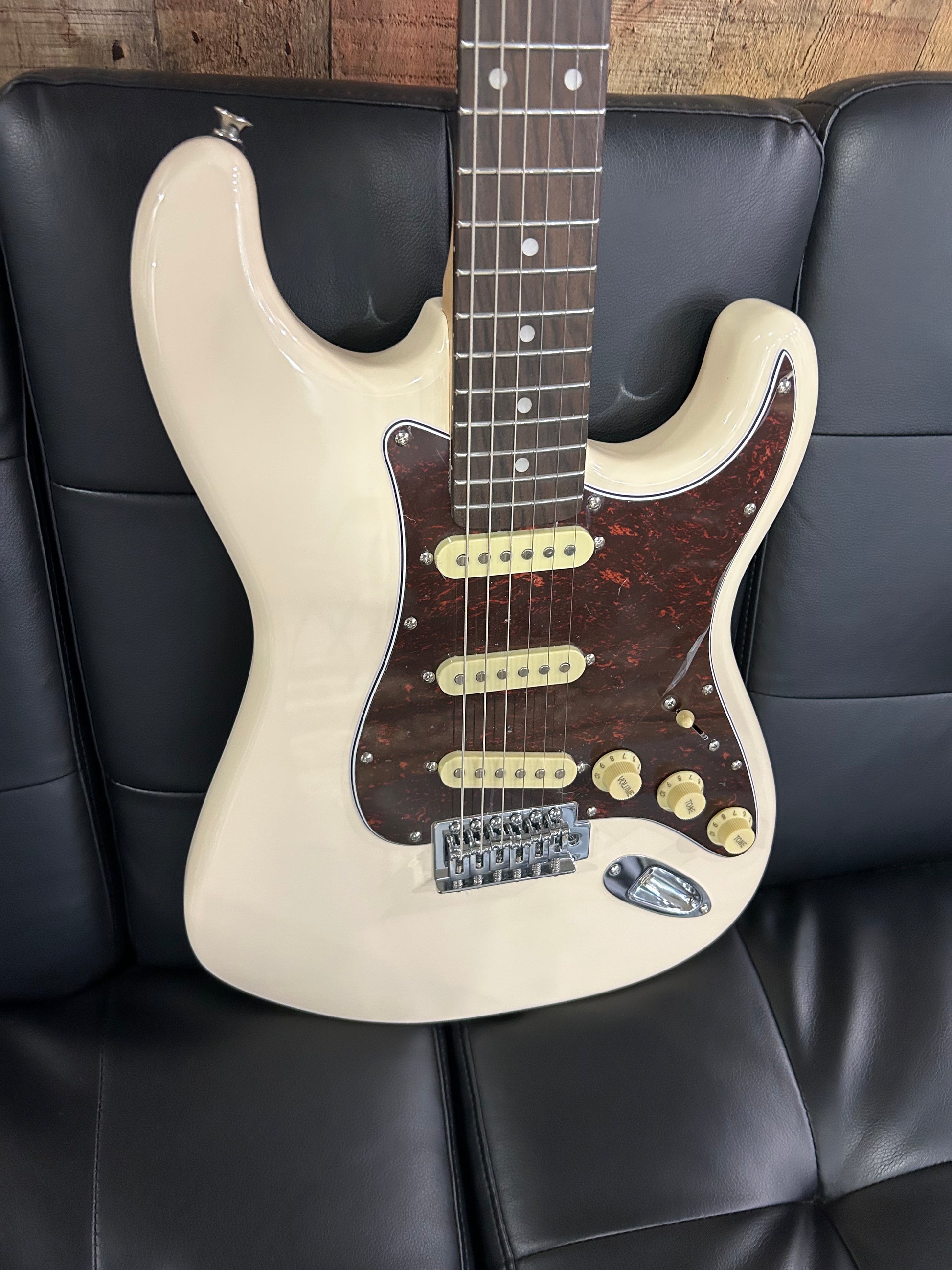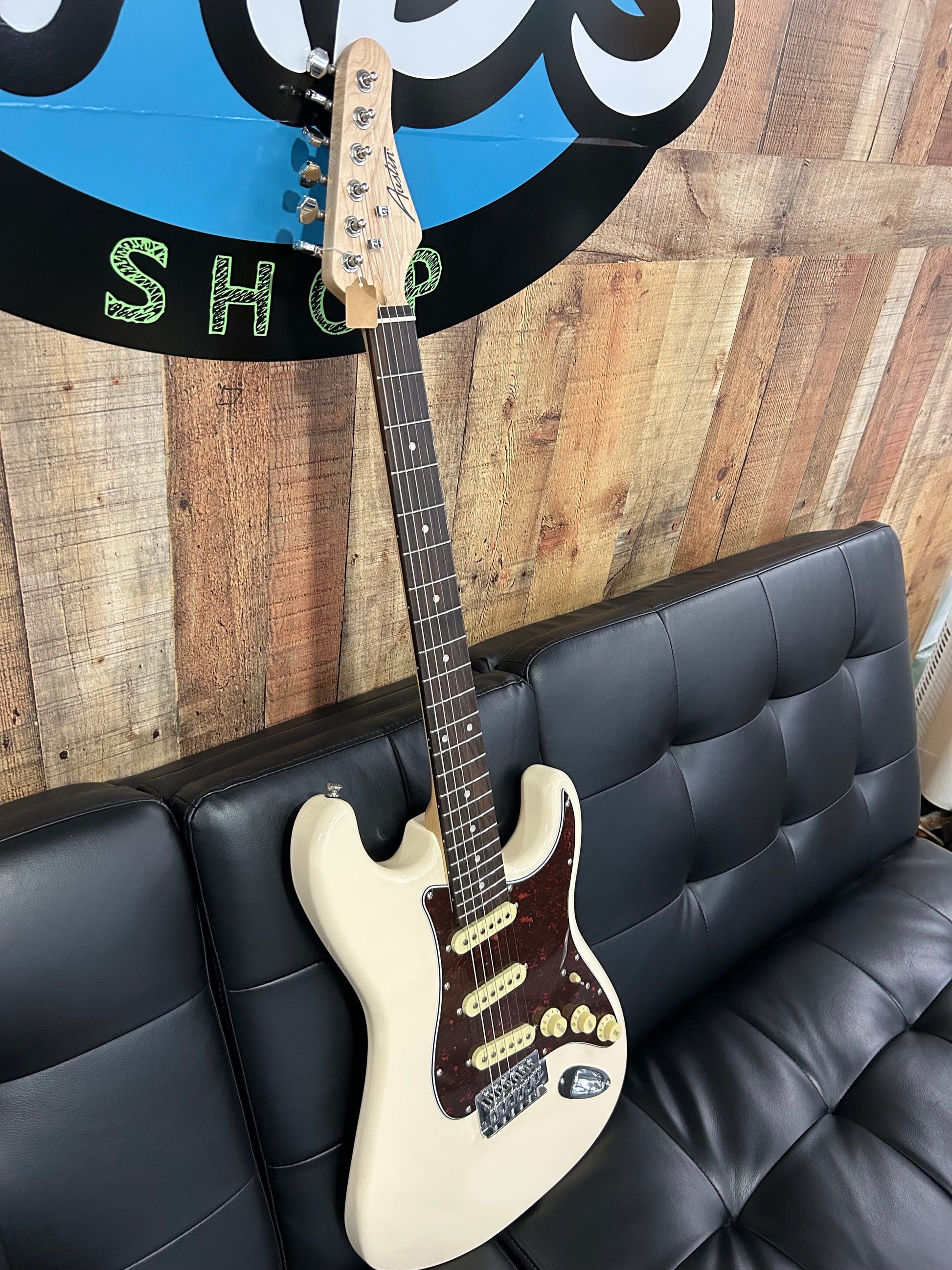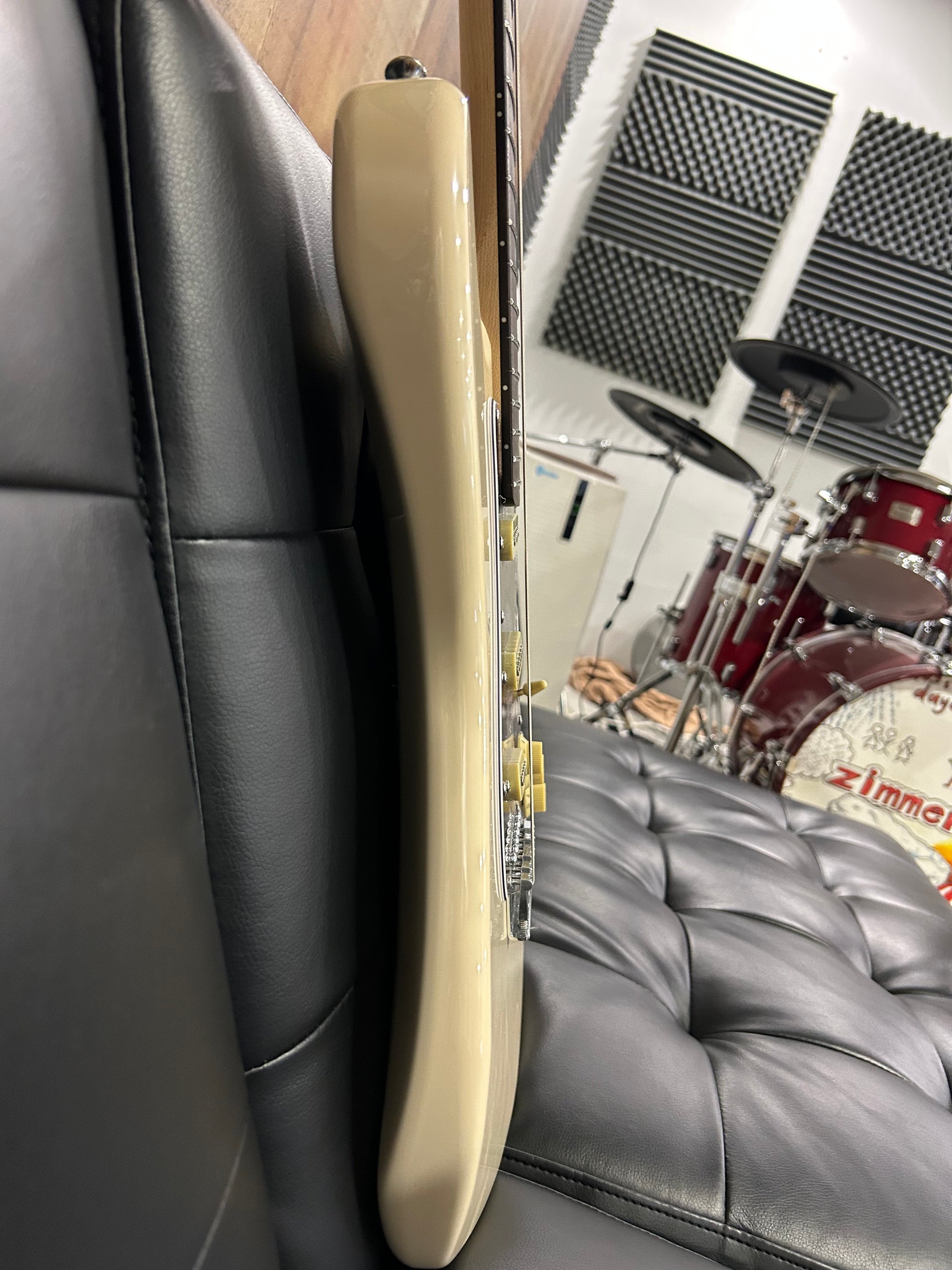 That aged cream finish and tortoise pickguard combo say vintage vibes, while the triple single-coils are ready to go from bluesy whispers to full dad-rock glory. It’s smooth, stylish, and just cocky enough to pull off a solo in the grocery store parking lot.