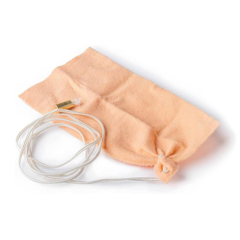 Made of synthetic chamois cloth. Will not harden or dry out. Nylon cord, metal weight.